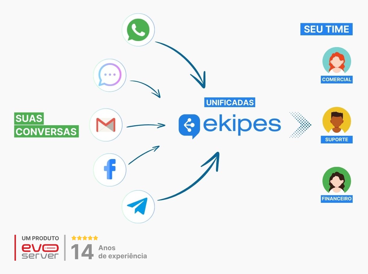 Simplifique sua comunicação com Ekipes, a ferramenta definitiva para centralizar suas mensagens e contatos em um único painel. Otimize o tempo de resposta da sua equipe integrando todos os seus canais de atendimento. Com Ekipes, seus funcionários terão acesso fácil e rápido a e-mails, WhatsApp, Telegram, Facebook e Instagram (em breve), tudo em um só lugar.