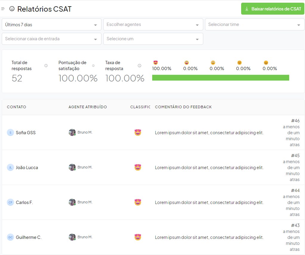 O recurso de relatórios permite visualizar o número de mensagens enviadas por cada operador e o tempo de resposta, além de outras informações.